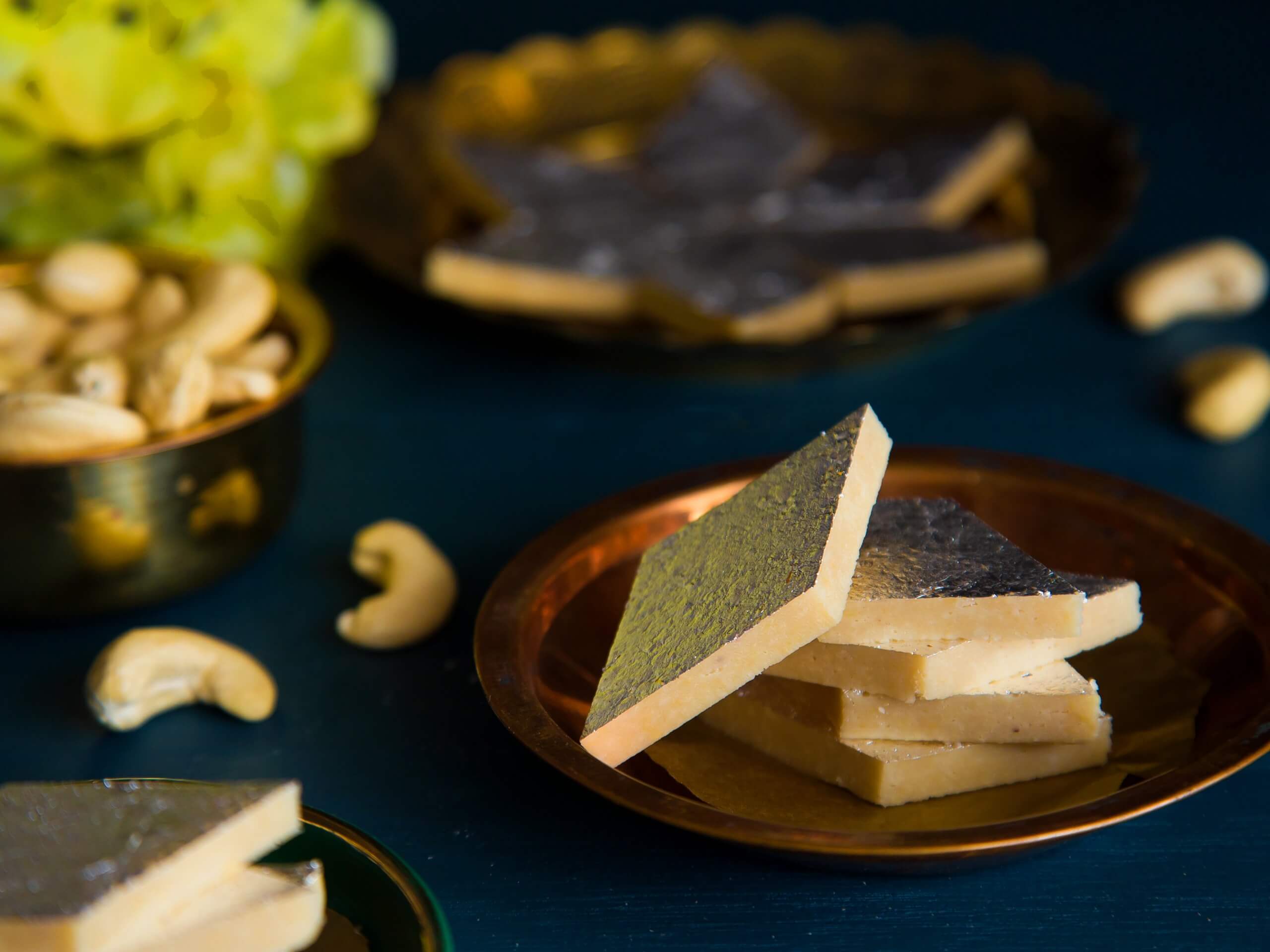The Indian delicacy Kaju katli (meaning "cashew slice"), also known as Kaju Barfi, is similar to a barfi. Barfi is created by thickening milk with sugar and other components.